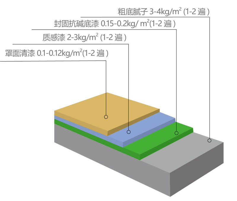 耗 漆 量 :理論值— 2-3kg/平方( 實際耗漆量會因施工方法、基層表面干硬程度和粗糙度及施工環境而有差異 )